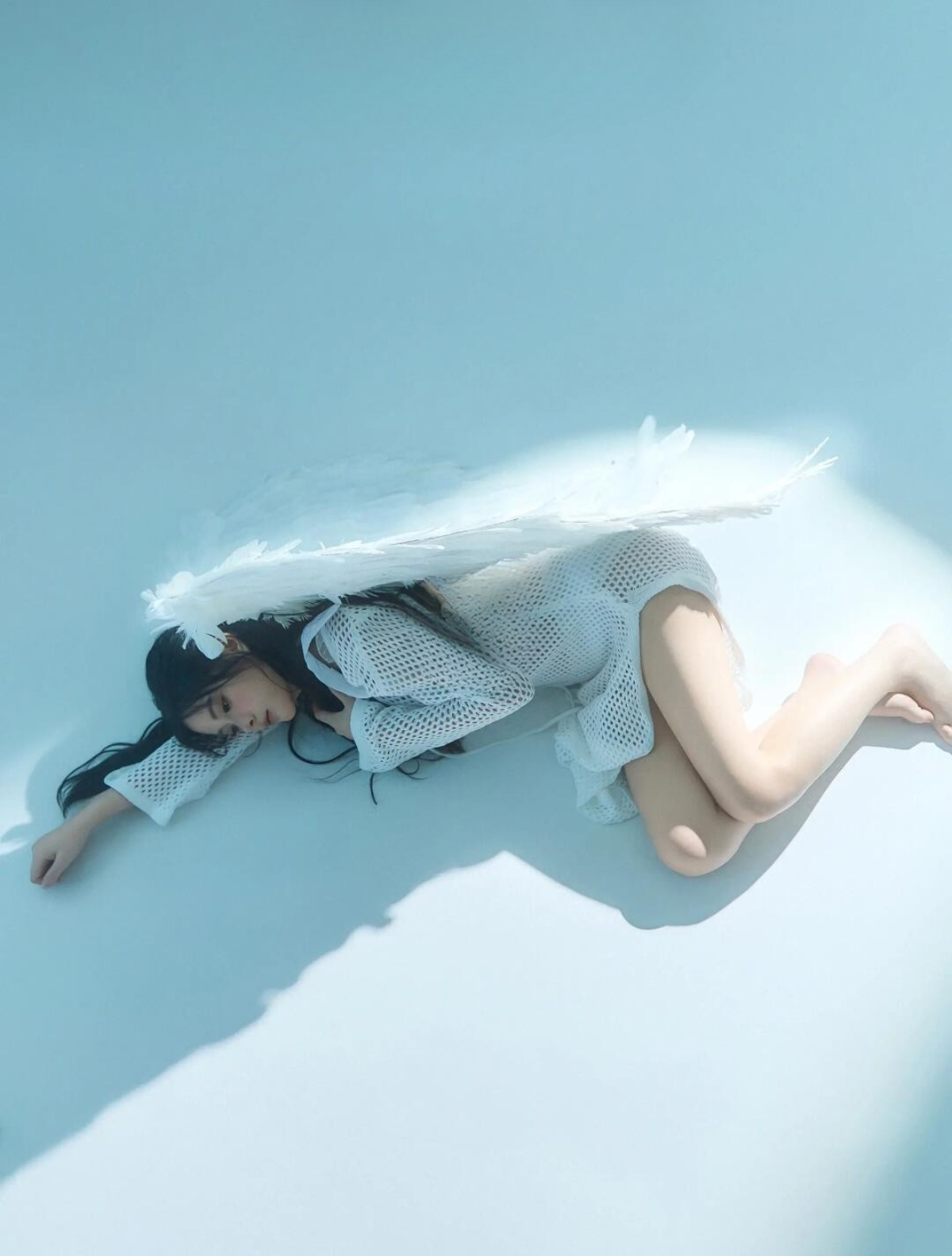 Tông trắng – xanh lạnh, ánh sáng mờ ảo và đôi cánh tinh khôi tạo nên khung hình tựa như bước ra từ một giấc mơ.